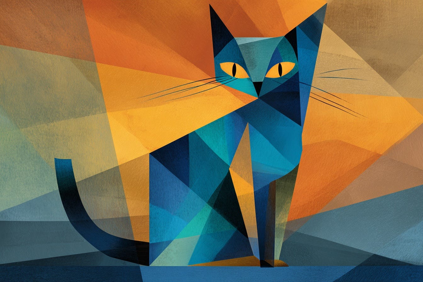 a cubist cat character with angular whiskers and geometric eyes, painted in bold blues and oranges with intersecting planes. the feline sits in a fragmented pose with triangle ears and diamond-shaped pupils. warm background gradients contrast with cool foreground elements. --ar 3:2