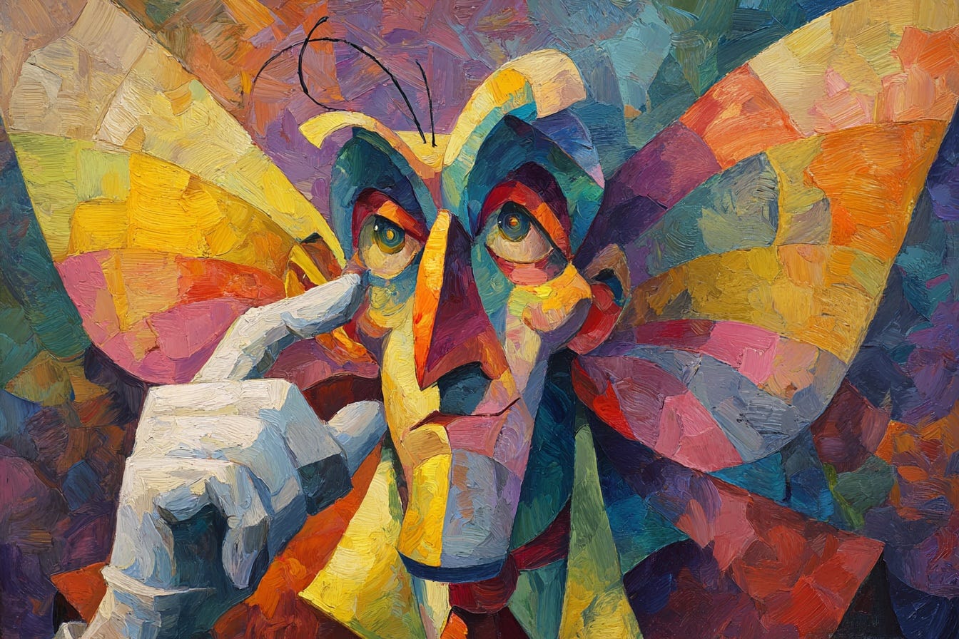 an abstract character with butterfly wings, portrayed in the style of picasso’s cubist style, with exaggerated features and bold colors. the background is an array of warm hues. a hand holding the head wears white gloves, adding to its whimsical appearance. --ar 3:2