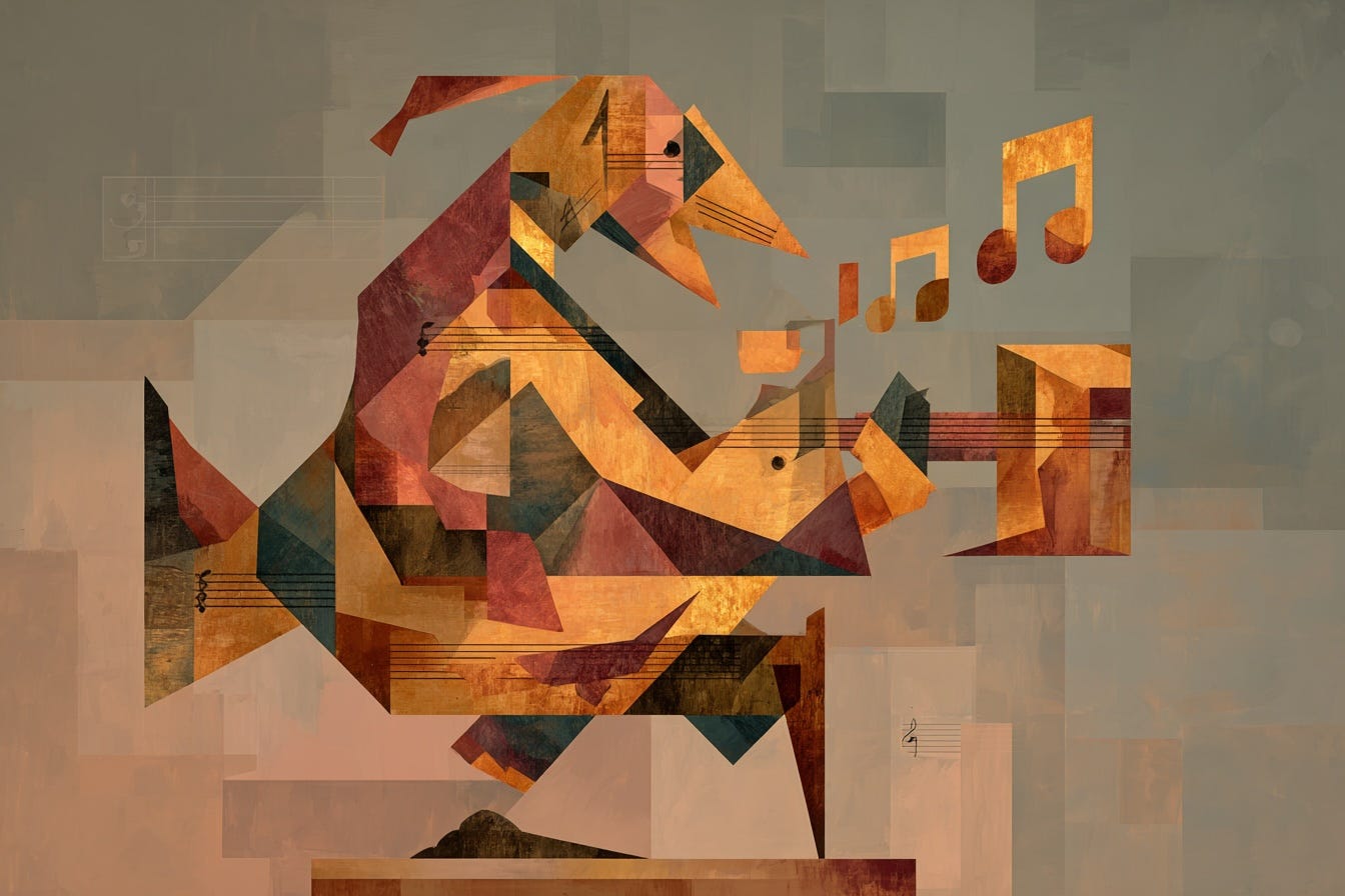 a cubist bird character playing a geometric instrument, rendered in Picasso’s analytical style with earth tones and golden accents. overlapping rectangular and triangular forms create the bird’s body while maintaining recognizable beak and wing elements. musical notes float as geometric shapes. --ar 3:2